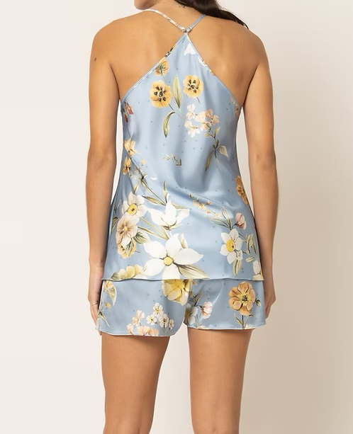 O design é enriquecido com renda aplicada à mão, um detalhe artesanal que cria um contraste delicado sobre o brilho do cetim no tom azul. Com alças ajustáveis para um caimento sob medida, o Flora Blue transforma suas noites em uma experiência de puro requinte e bem-estar.